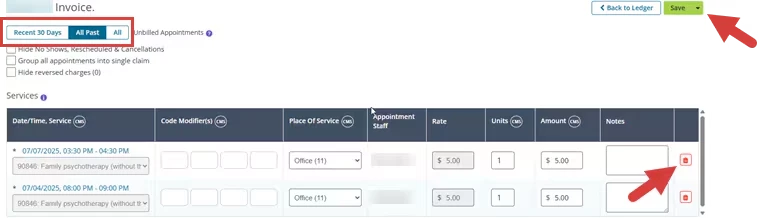 icon to remove any Dates of Service you don't want to include in this Invoice.