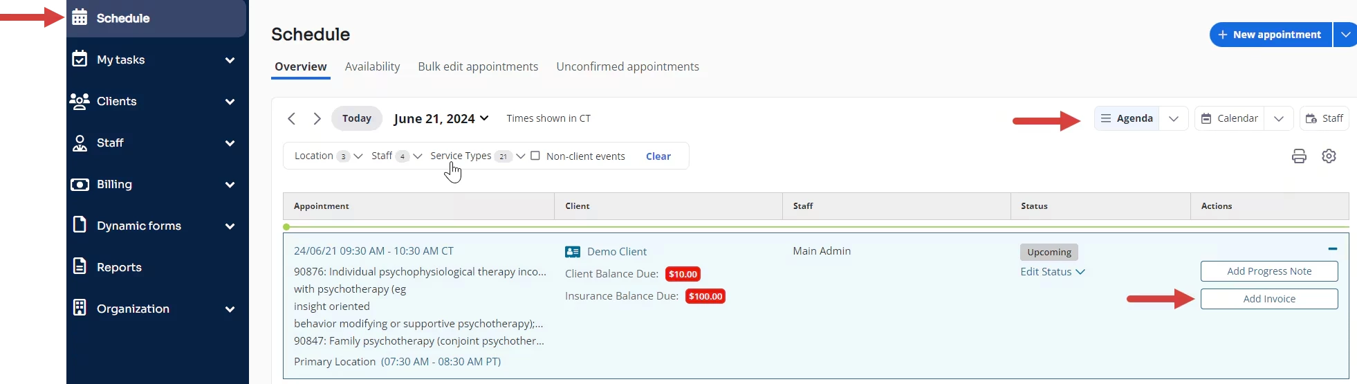 To correctly bill in My Clients Plus by Ensora Health, ensure you are creating Invoices for EACH Appointment. You can create Invoices from three places in My Clients Plus, the Agenda, and the Client Ledger. After an Invoice is created you can accept/apply a payment.