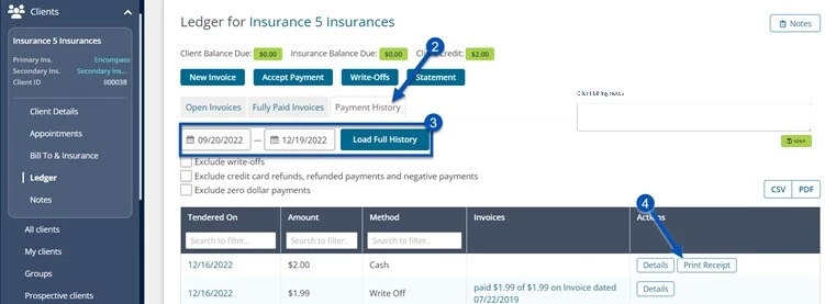 You can view a Client Payment History and print Payment Receipts from the Client Ledger.