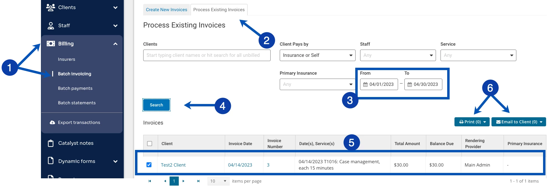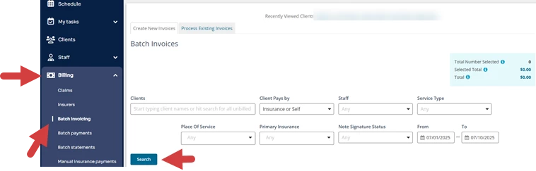 Batch invoicing allows you to find all unbilled Appointments in a desired date range and create Invoices for them all at once. You can create Invoices per Client or Staff, or for ALL Clients and Staff.