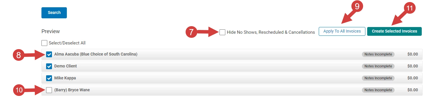 - Select Hide No Shows, Reschedule & Cancellations box if desired to filter. Clients with unbilled Appointments display.