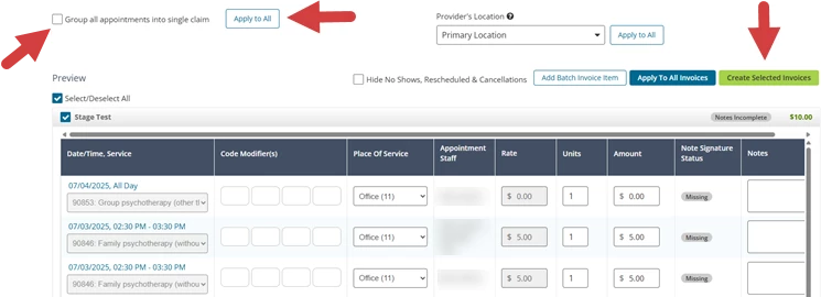 IMPORTANT: Invoices created via batch invoicing for multiple appointments will create one claim per code when that invoice is billed electronically or a CMS-1500 form is generated. If you wish to include all items on an invoice created via Batch Invoicing on a single claim, click the details of that invoice and select the Group all appointments into single claim checkbox. See Group All Appointments into a Single Claim for more information.