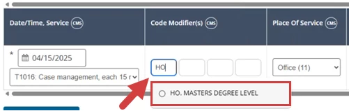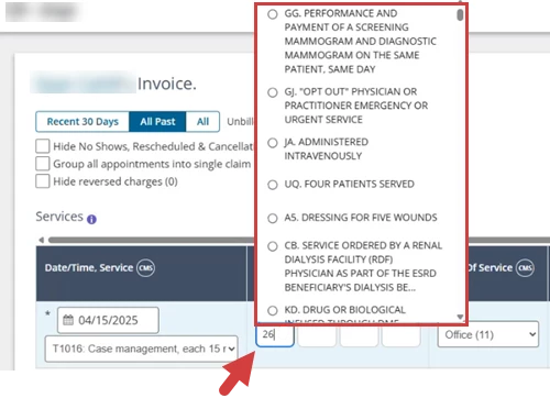 - Open an existing invoice or create a new invoice, then select a service type. If there is a default modifier for that service type, it will populate in the Code Modifiers Column.
