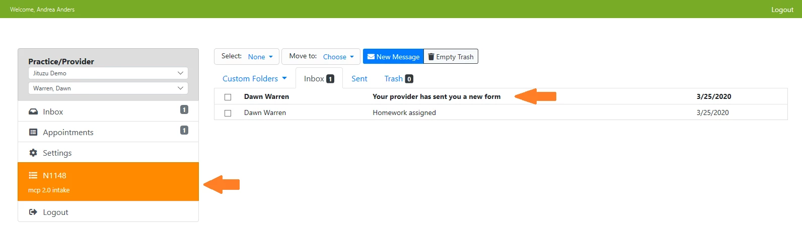 - The Client will receive a Client Portal Inbox Message to alert them when Intake Forms are assigned. The system will email the client at the email address associated with their account, to let them know they have a new Client Portal message. In the Client Portal, the client will receive an Inbox Message letting them know they have received a form. The client must be logged into the Client Portal on an internet browser to fill out the intake form. The client can click on the form, complete it and click Submit.