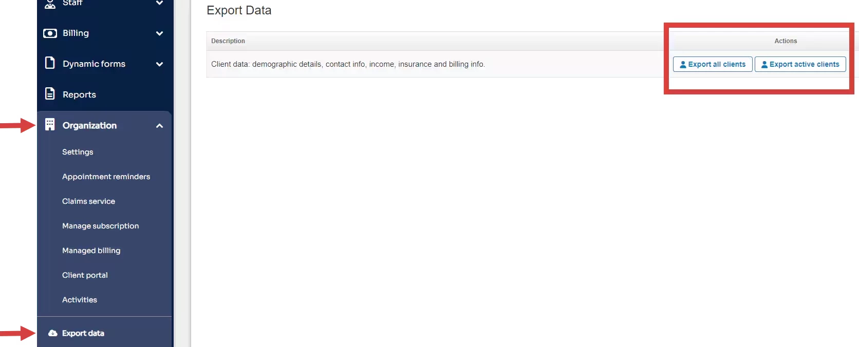 To export demographic details, contact information, income, insurance and billing to an excel spreadsheet, use the Export Data page under Organization.