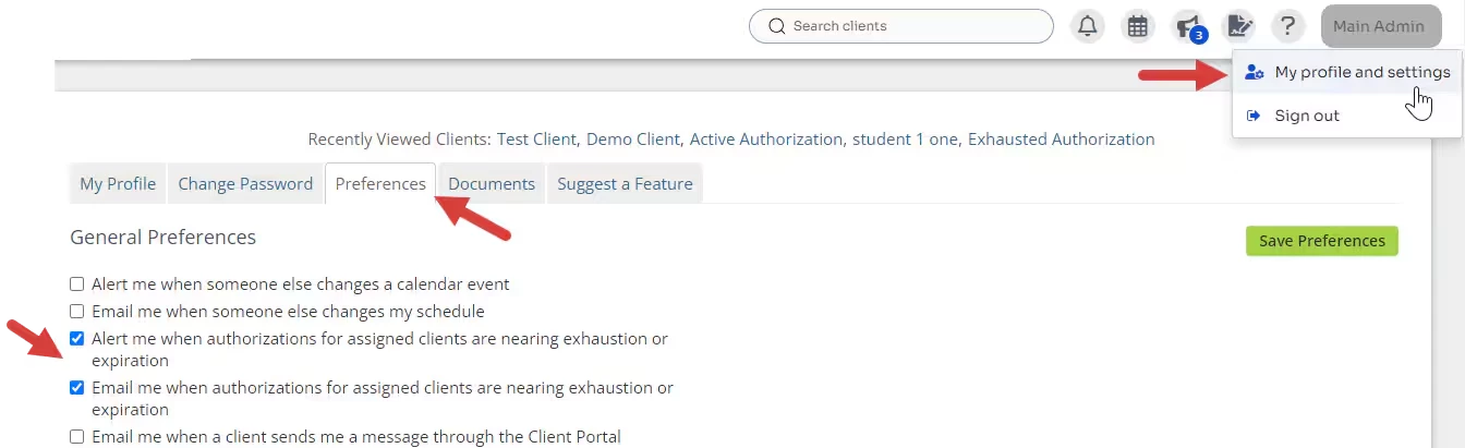In WebABA, you have the ability to track Authorization by Service Type or Units. You can receive alerts and/or emails when there are no Authorized Units or Sessions left or if the Authorizations is expiring by going to your My Profile & Settings> Preferences > General Preferences and checking the setting for Alert me when authorizations for assigned clients are nearing exhaustion or expiration and Email me when authorizations for assigned clients are nearing exhaustion or expiration.