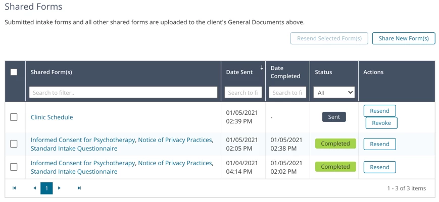 - You can view and manage Documents sent to a Client's Portal at the bottom of the General Documents page. You can track status (sent/completed), resend and revoke forms, as well as share new forms not sent previously.
