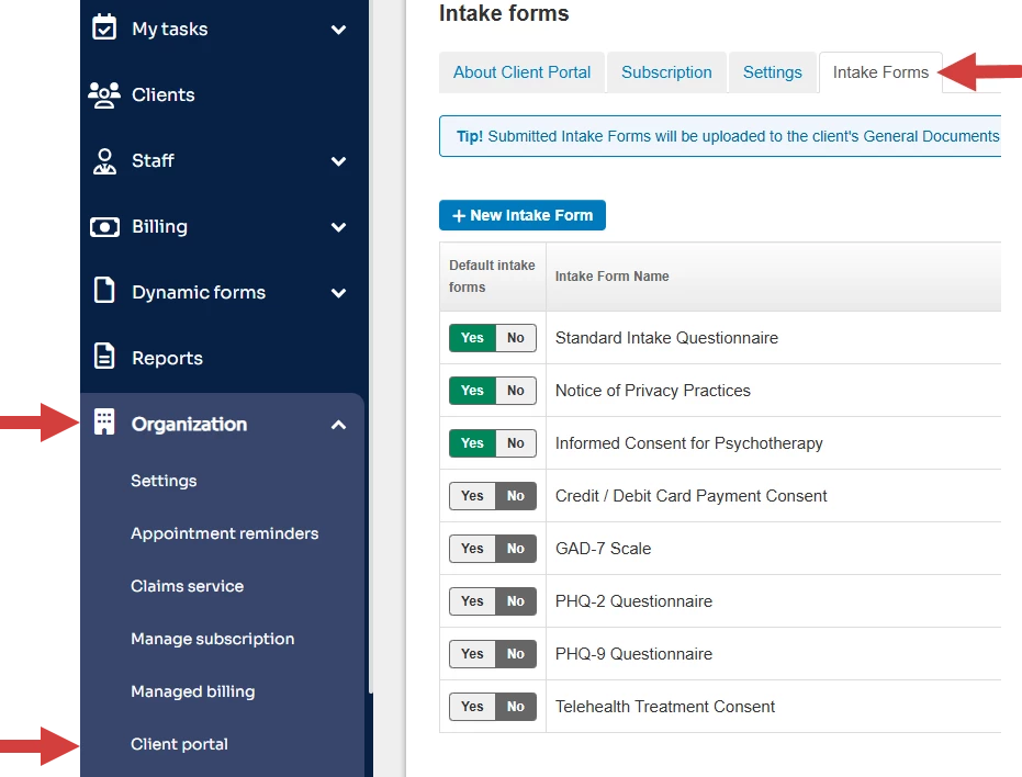 - Navigate to Organization > Client Portal and click Intake Forms tab.