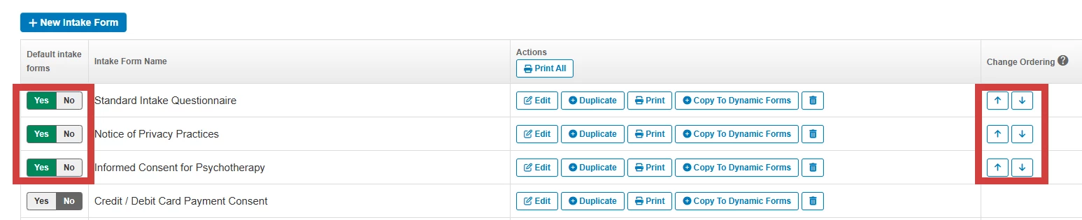 Default Forms are Forms you want every Client to fill out no matter what age, treatment etc. You can determine which Forms will automatically be included, and which order they will display for the Client to fill out.