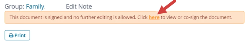 - A notification displays at top. "This document is signed and no further editing is allowed. Click here to view or co-sign the document."
