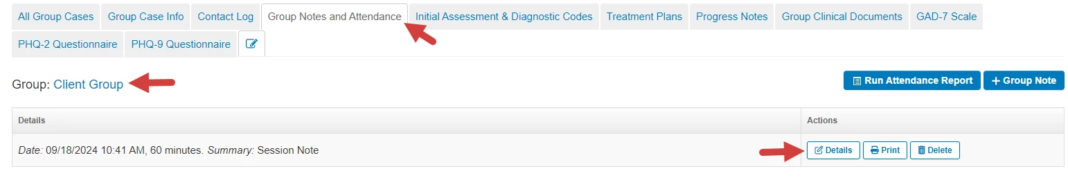 - Click Notes button and Group Notes and Attendance tab opens.