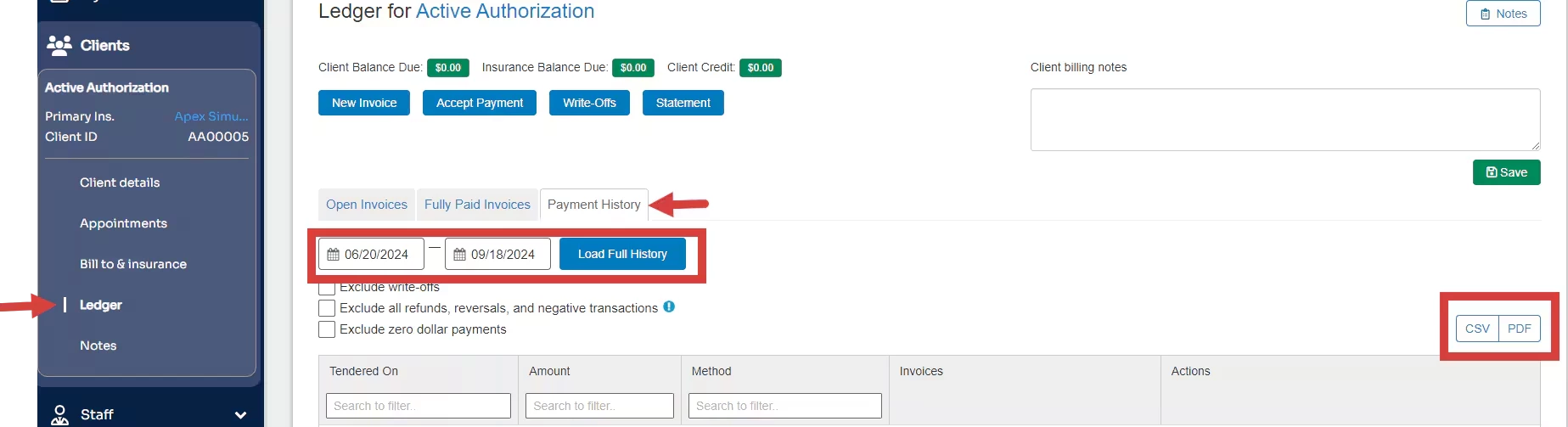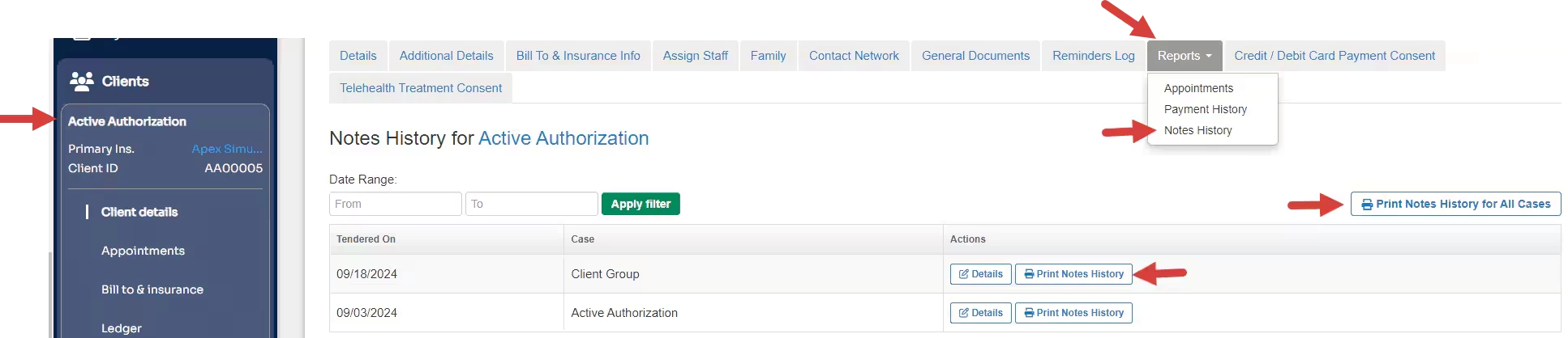 The Notes History for a Client can be found on their Client Profile and must be exported individually for each Client. There is no bulk export option for Client's Note History.