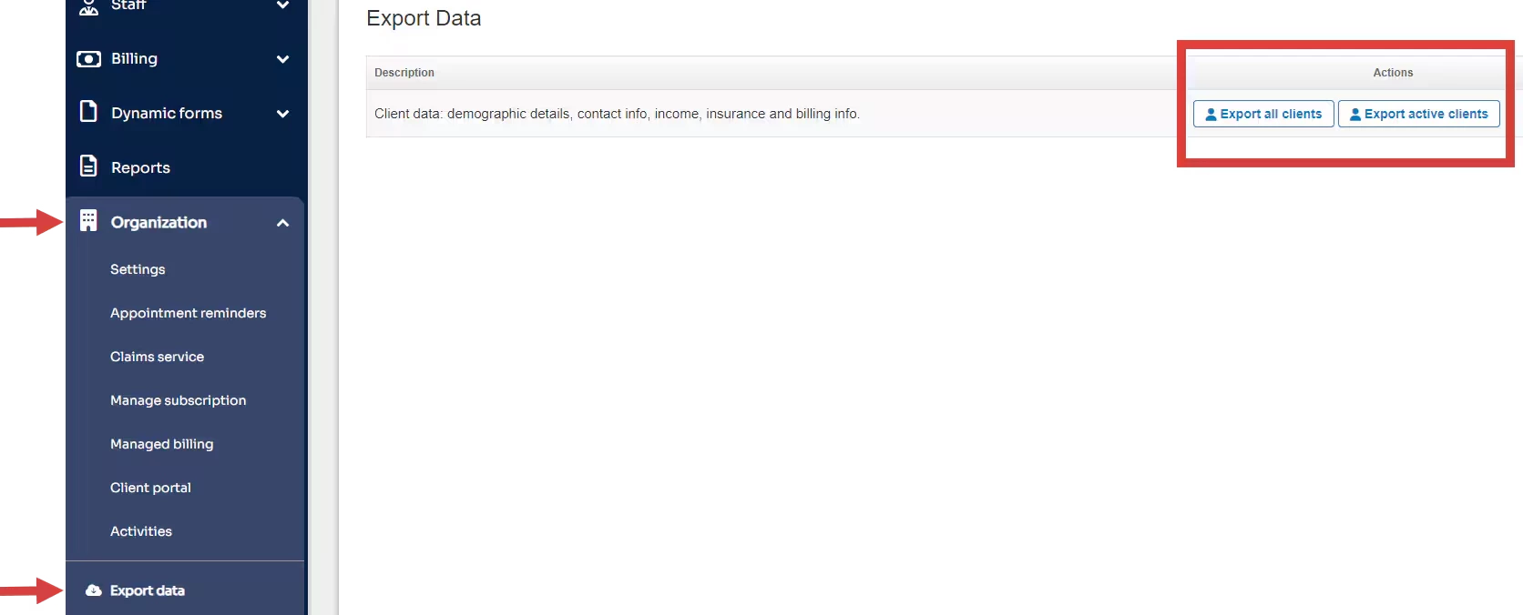 To export demographic details, contact information, income, insurance and billing to an excel spreadsheet, use the Export Data page under Organization.