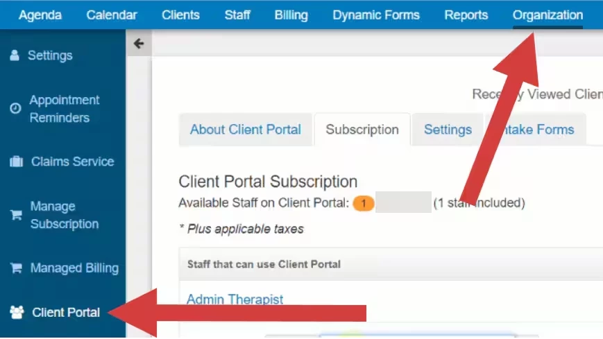 PERMISSIONS REQUIRED: Organization Administrators can subscribe Therapists to the Client Portal.