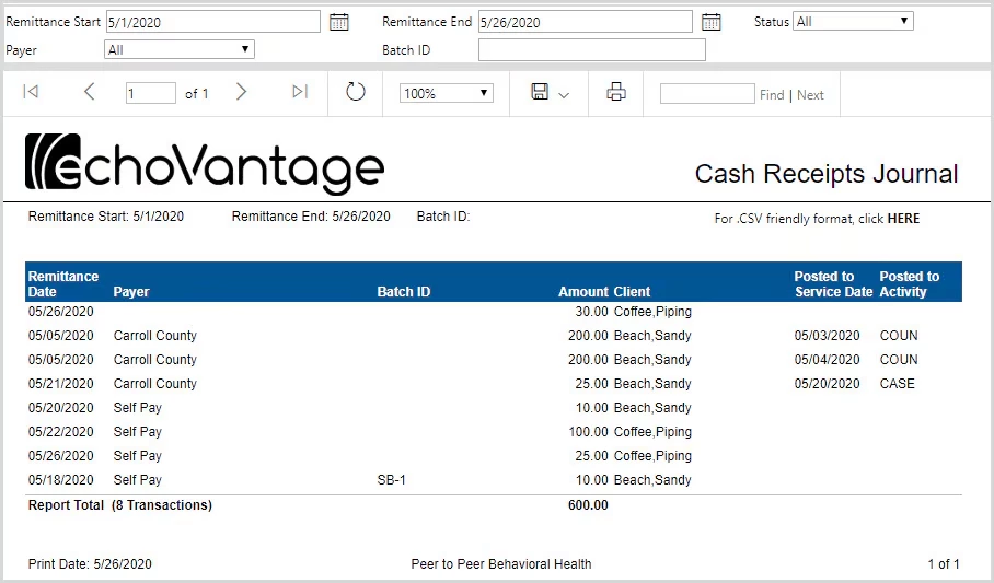The Cash Receipts Journal is a list of all payments received from both Payers and Clients. This report can be filtered by Start and End Date, Status, Payer, and Batch ID. A Client Payment is included on the day it is received. The subsequent process of applying all or part of the Client Payment to a service does not generate another entry on this report.