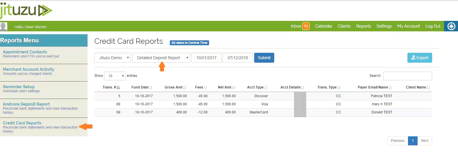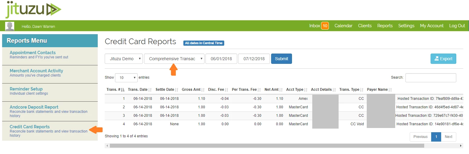 The Comprehensive Transaction Detail Report gives the specific details on Settle Dates, Fees and Net Amounts. This report may be sorted by header column and downloaded by clicking the Export button.