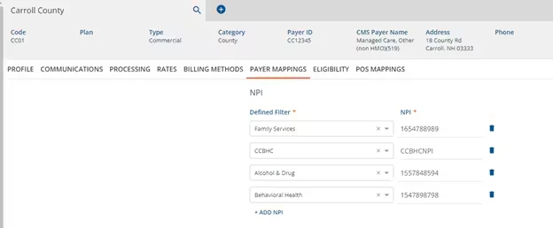 - A Defined Filter should be created for CCBHC services. This Defined Filter must be saved against the agency’s CCBHC-specific NPI in Payers > Payer Mappings for all Payers who apply.