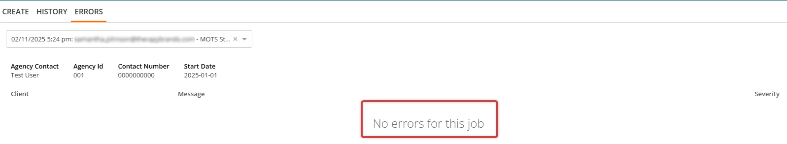 - If the selected job does not have any errors, the following message will display in the list view: "No errors for this job".