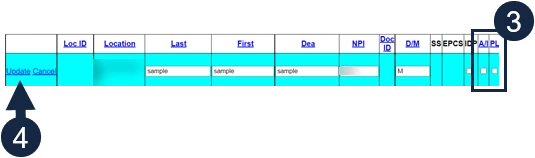 NOTE: If you need to reactivate this provider, Click the Edit button again, check the AI and PL columns, then click Update. Reactivated providers must be registered with Surescripts.