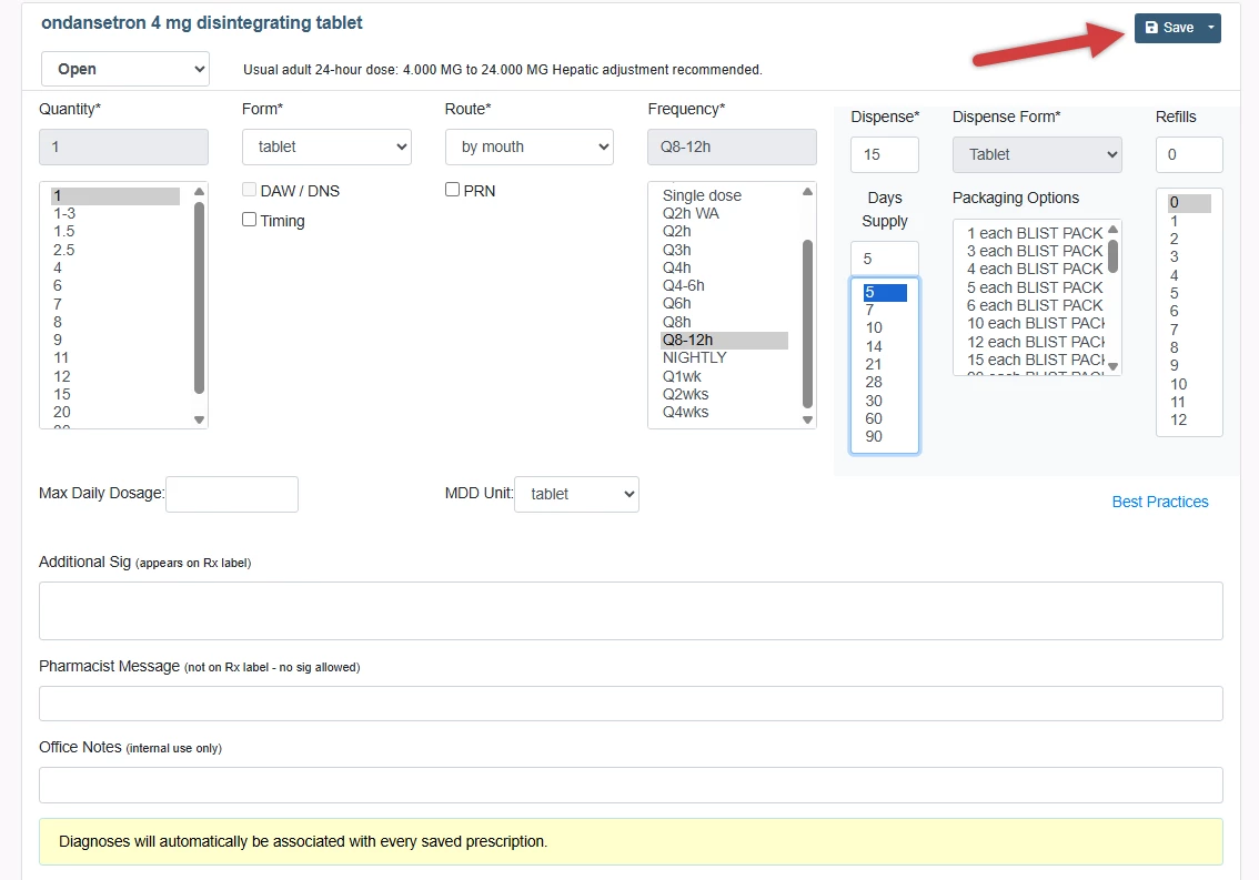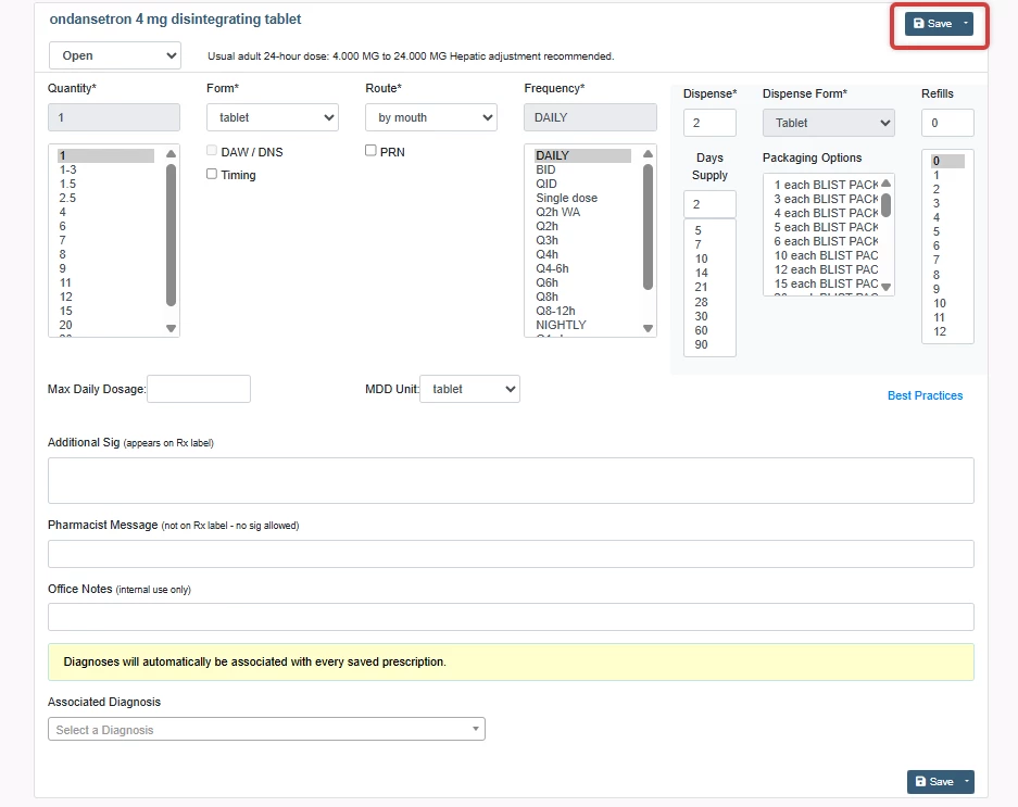 - Enter Route and Frequency details, Dispense Information, Associated Diagnosis and other instructions, then click Save.