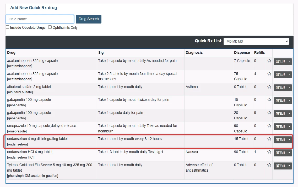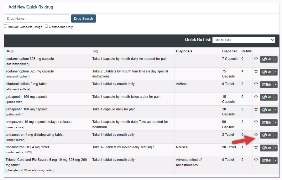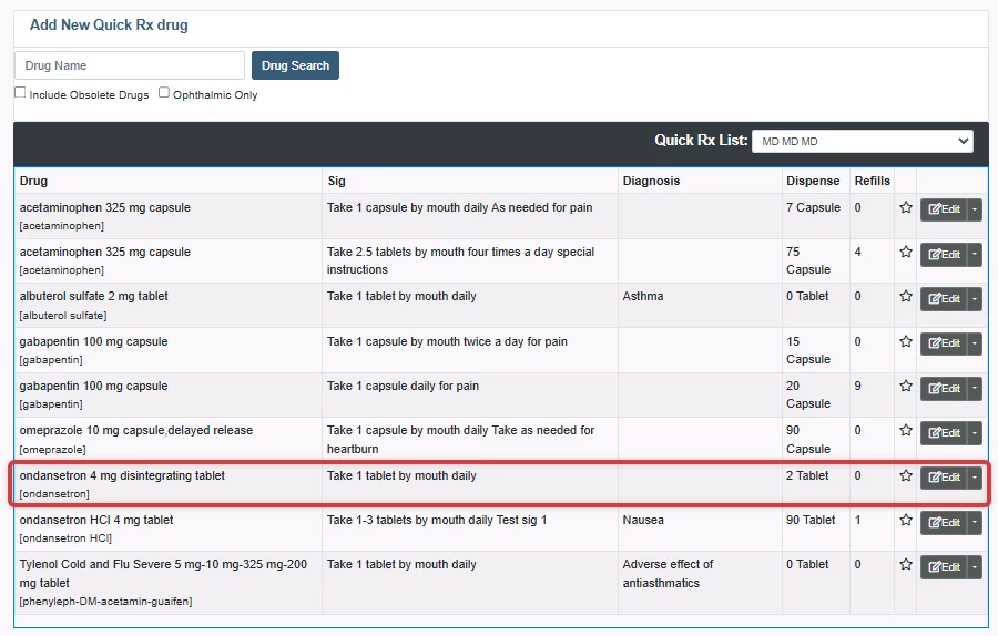 NOTE: Click the dropdown arrow on the Edit button and select Delete to remove the prescription from the Quick Rx List.