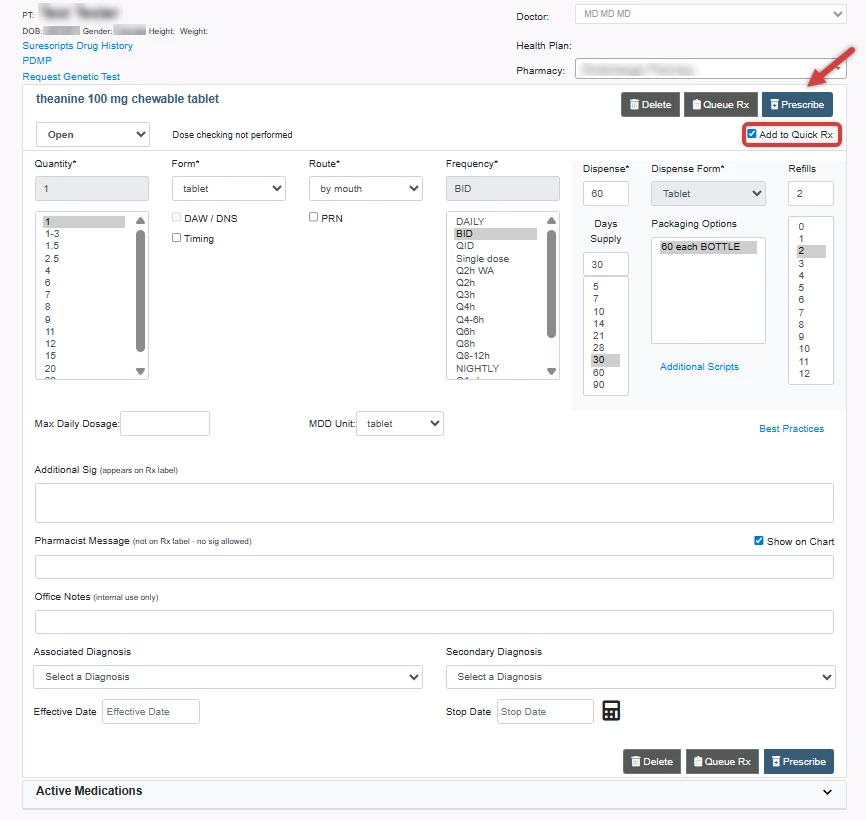 - Click Prescribe. The Prescription is saved to the Doctor's Quick Rx List.