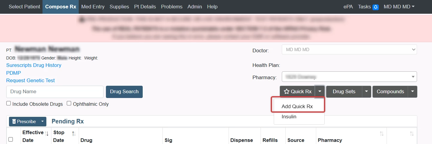 - The Prescription is saved to the Doctor's Quick Rx List.