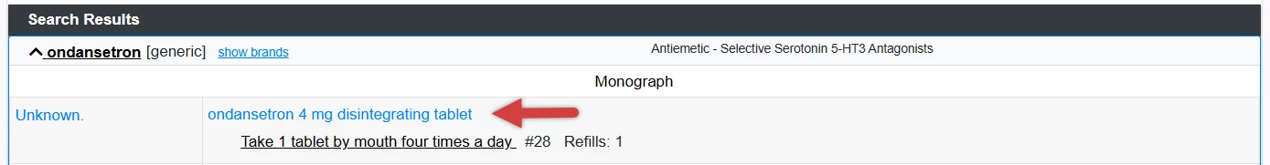 - Search results display. If there are many results, each category of drug will be minimized by default.