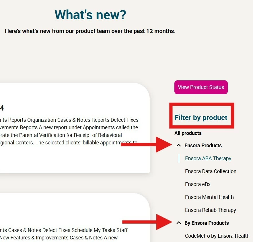 The What’s new section contains an easy product filter on the right side. Simply click the drop-down arrow next to Ensora Products or By Ensora Products to filter release notes by product.
