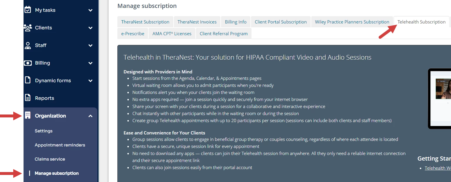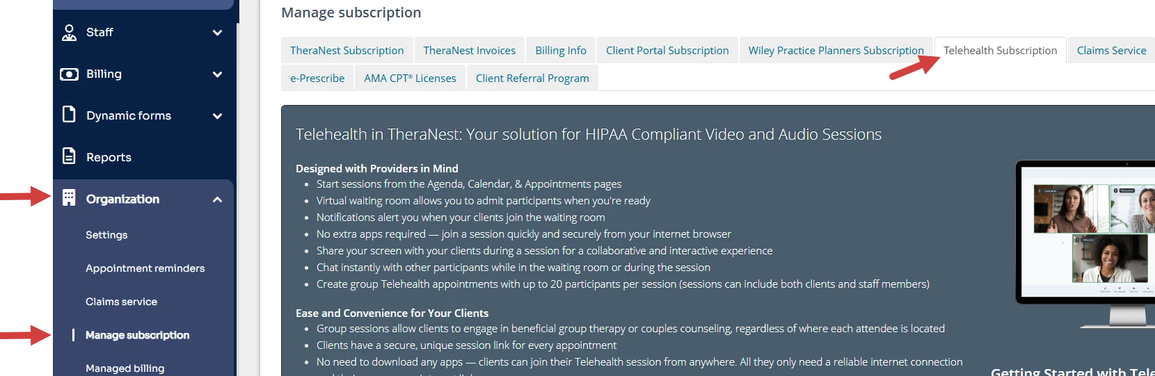 Telehealth subscription is an optional, HIPAA compliant, add-on service with your monthly subscription. Learn More: Telehealth Overview
