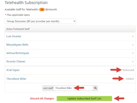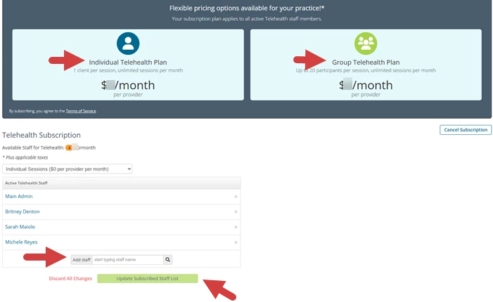 After you have subscribed to telehealth, you can subscribe or remove staff from the plan.