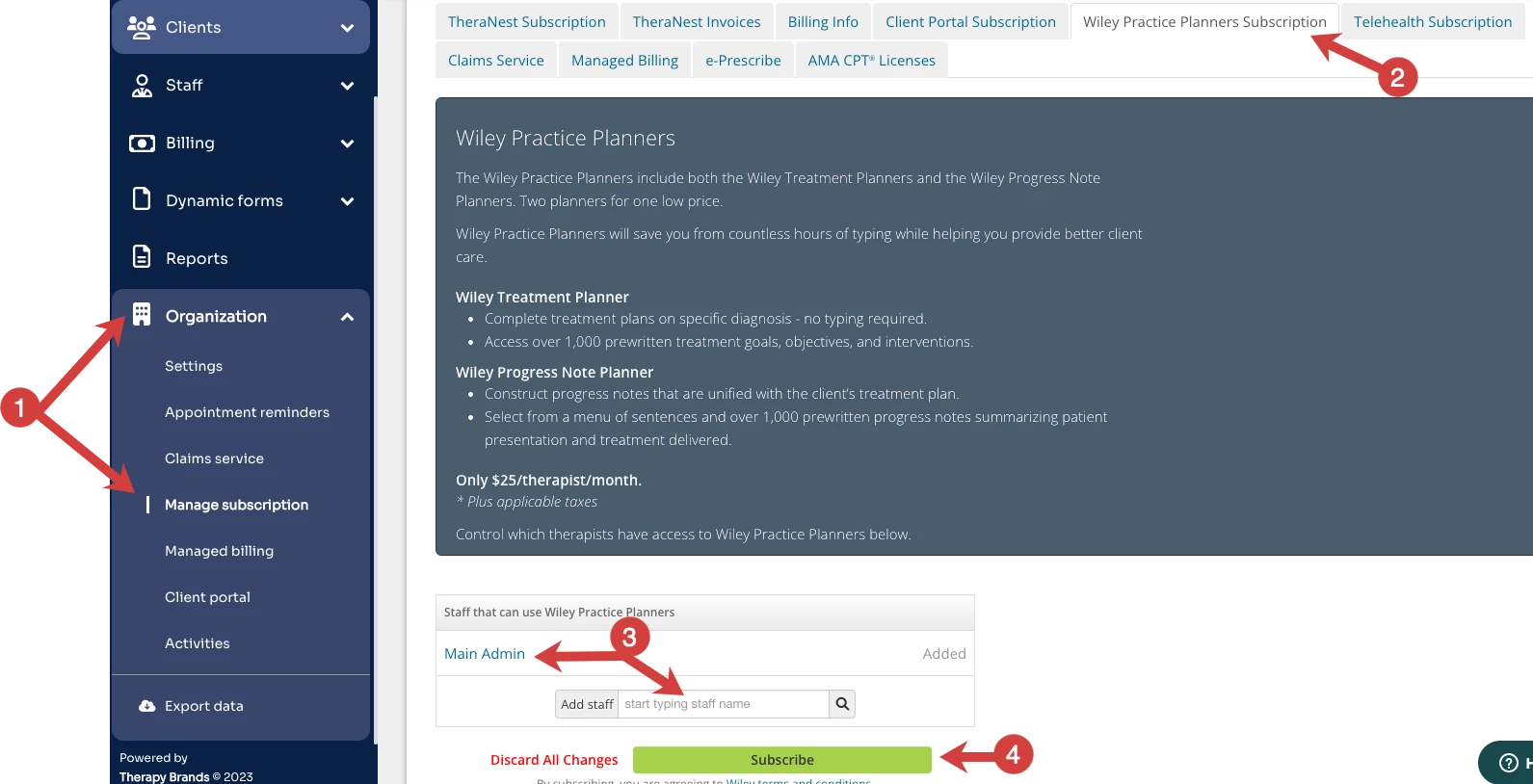 Wiley Practice Planner is an additional subscription per therapist per month. Organization Administrators can subscribe desired Therapists who wish to utilize this tool. The point and click features allow you to save time with administrative tasks and focus more on your Clients. You'll be able to move through your Treatment Plans and Notes quickly allowing you to better serve your Clients.