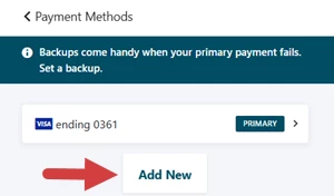 If you have multiple payment methods on file, you can indicate which one is the Primary payment method. This will be used as the default payment method for your subscription. You can change the primary payment method or add a new payment method at any time.