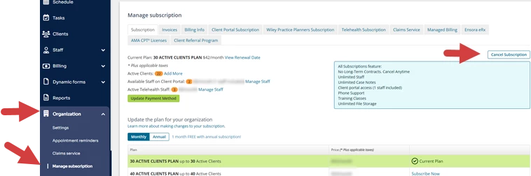 - Compete the steps to cancel your subscription. Your subscription will be cancelled at your next renewal date (monthly or yearly). At that time, you will be able to subscribe to the Per Provider Plan.