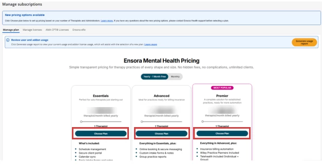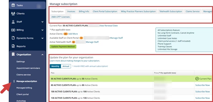 NOTE: Users on this plan can migrate to the Per Provider Plan when their current subscription expires or is cancelled. For more information, see the section below: Migrate from Active Client Plan to Per Provider Plan