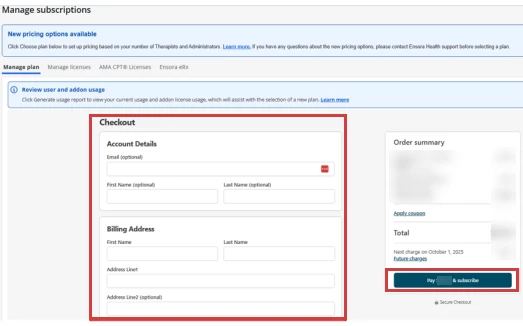 - Complete fields in the Account Details, Billing Address, and Payment Details sections, then click Pay $(Your Subscription Charge) & Subscribe to complete your subscription purchase.