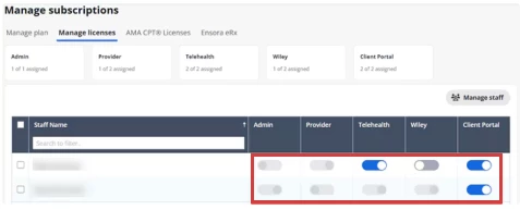 - When you manage licenses for your clinic, you will only see licenses that are available on your subscription plan. If you need access to additional licenses, you may need to edit or change your subscription plan. Learn More: Manage Subscription & Add-Ons: For Trials & Subscriptions Starting After May 22, 2025.