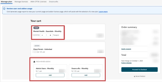- Click the Plus and Minus buttons in the Plan section to select the number of Provider (Therapist) licenses.