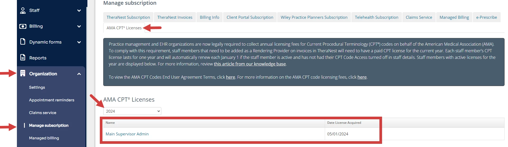 Practice management and EHR organizations are now legally required to collect annual licensing fees for Current Procedural Terminology (CPT®) codes on behalf of the American Medical Association (AMA). To comply with this requirement, staff members that need to be added as a Rendering Provider on invoices in the system will need to have a paid CPT license for the current year. Each staff member’s CPT license lasts for one year and will automatically renew each January 1st if the staff member is active and has not had their CPT® Code Access turned off in staff details. For more information, review FAQ: CPT Codes & American Medical Association Fees.