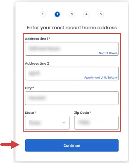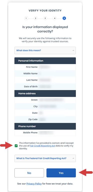 - Click the checkbox to indicate that The information is correct and Accept use of the Credit Reporting Act data to verify identity.