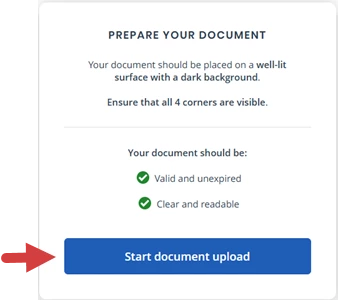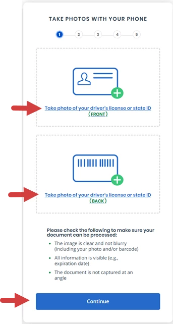 - Click the Continue button. You will receive a link via text to take photos of your identity document. You will see a confirmation screen that a link was sent to your while you upload your photos.
