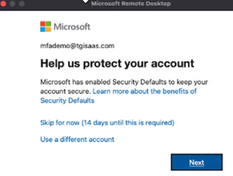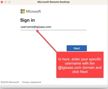 - This will prompt you to a Sign-in/login screen. On this screen, enter your specified username with the @tgisaas.com domain and click Next. This will bring you to a screen to enter your eCR remote desktop login password.