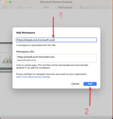 - Once the workspace window pops up within the app, add the following URL to the workspace URL field: (https://rdweb.wvd.microsoft.com/) and click Add once you see “A workspace is associated with this URL”: