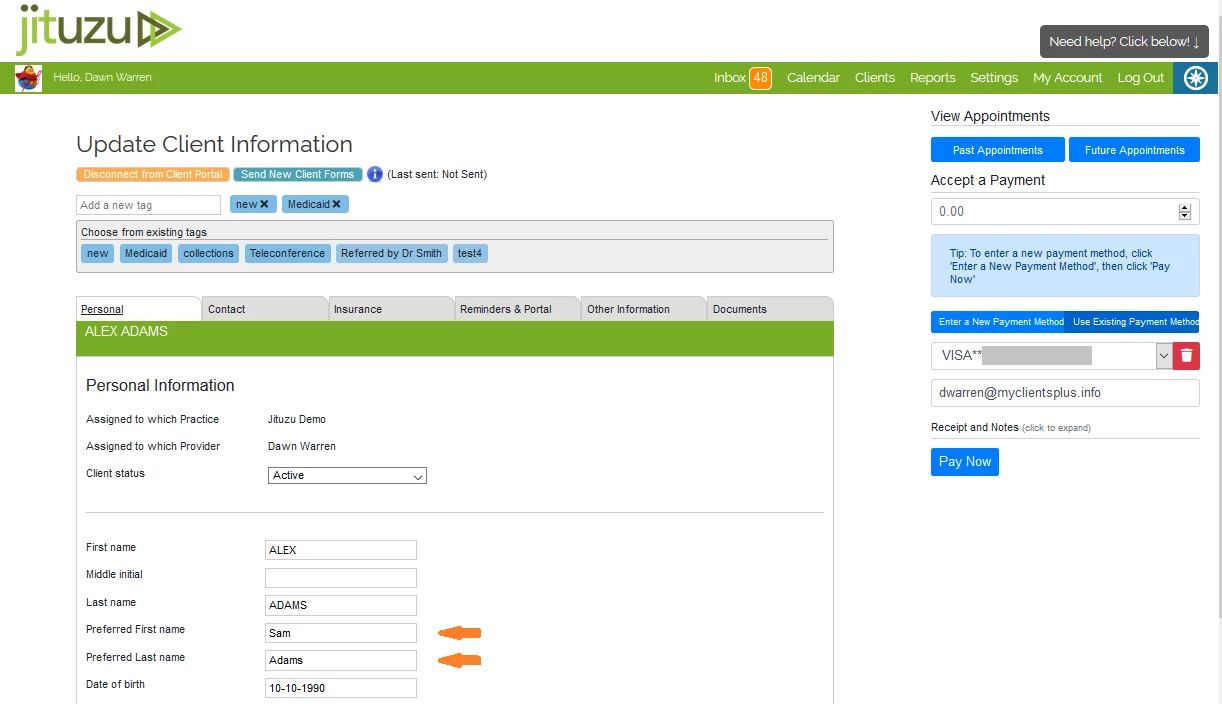 When a client logs into the Client Portal on an internet browser, they will see their Preferred name.