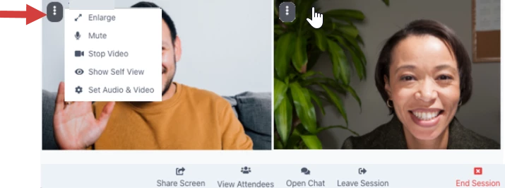 You can access the 3 Dot Menu for yourself OR your Client. From here you can Enlarge or Shrink a video, Mute, Stop Video or Hide Self View.