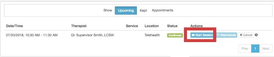 If your provider uses the Client Portal, access the Telehealth Session link in your Appointments tab. Find your Appointment and click Start Session.