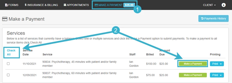 Once logged into the Client Portal you will be able to see a balance due and the Make A Payment option. You can also Print Invoices and Superbills.