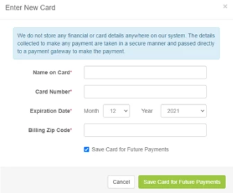 - If you clicked Enter New Card, you will enter payment information and click Save Card for Future Payments.