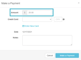 - Enter Amount, select a saved Credit Card or click Enter New Card, enter Notes, then click Make a Payment.