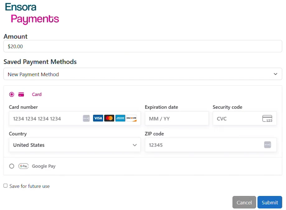 - If you selected New Payment Method, you will enter payment information and click Save for Future Use.
